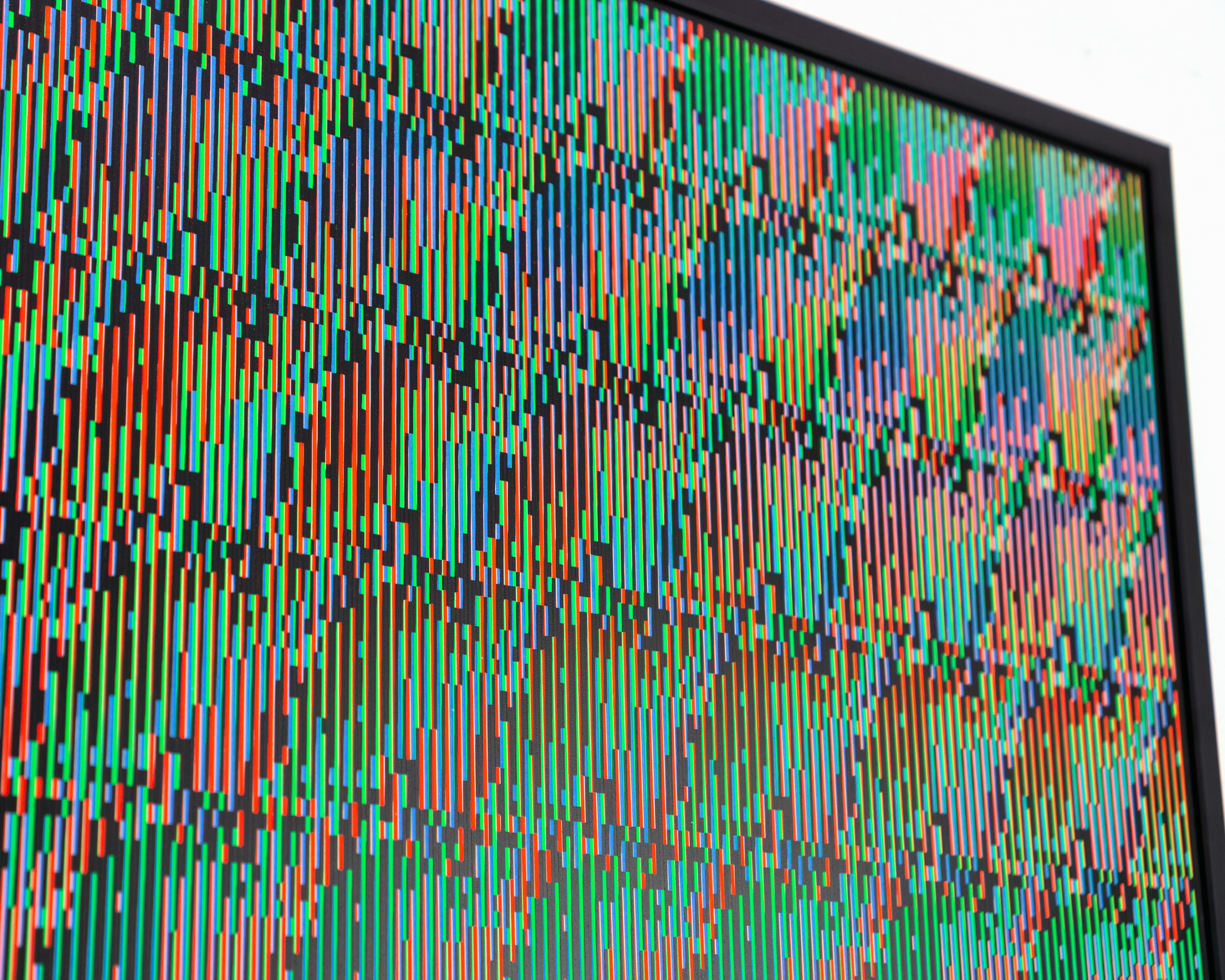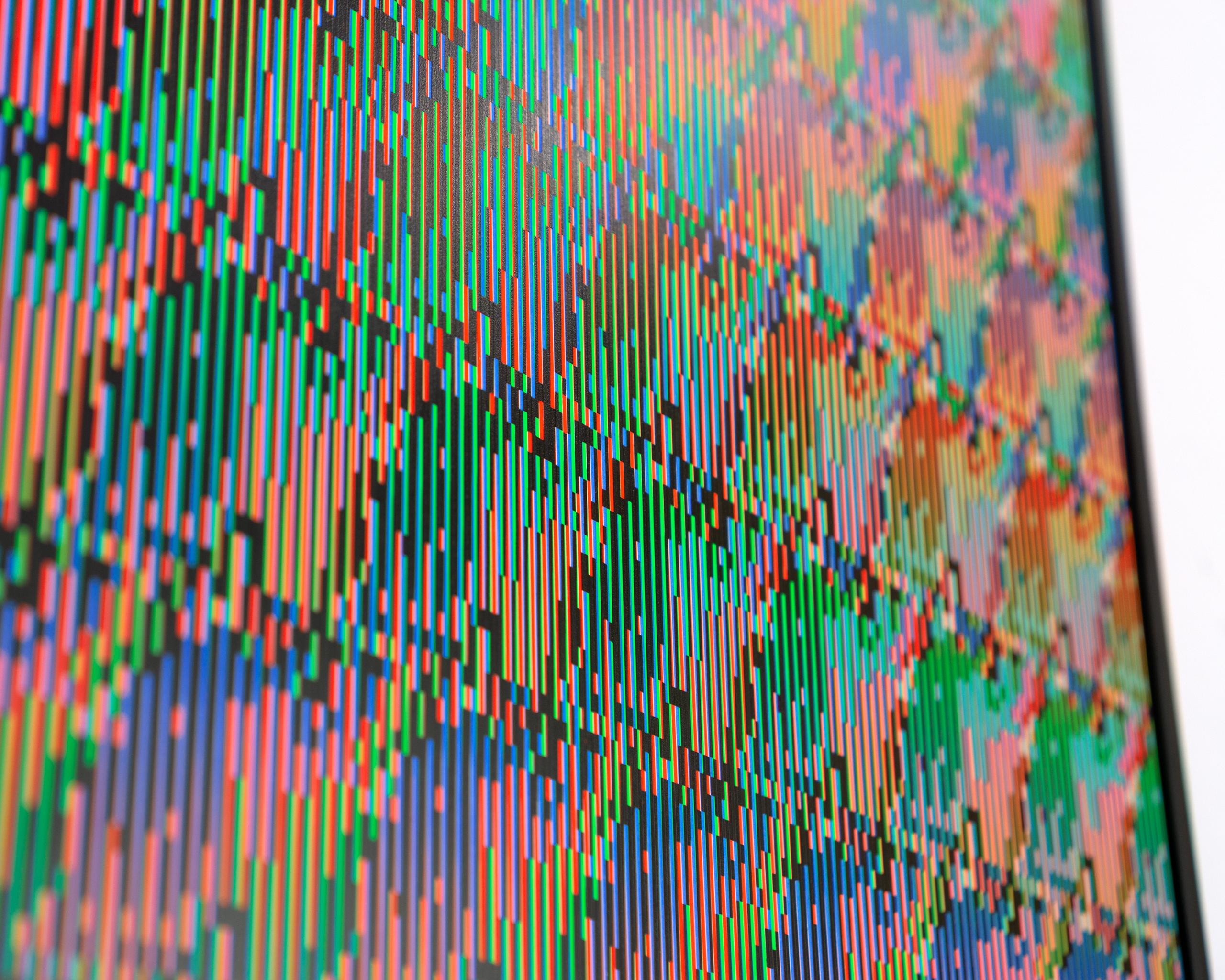 This process recreates the feel of a cathode ray TV on paper, with colors that appear unreal and almost impossible to achieve with traditional printing. Many viewers initially mistake the piece for an actual screen.